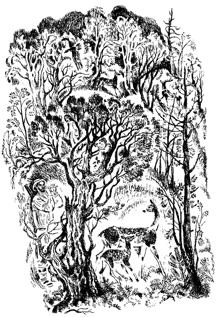 У самого моря из песка, будто спина окаменелого чудовища, виднелось полузанесенное песком огромное дерево; от вершины его остались два громадных сука, и они торчали, черные, узловатые, рассекая до горизонта голубое небо. На малых ветвях этого дерева висели белые круглые хорошенькие коробочки – это были выброшенные тайфунами скелеты морских ежей. Какая-то женщина сидела спиной ко мне и собирала себе в баульчик эти подарки моря. Вероятно, я был еще под сильным влиянием грациозного животного возле дерева, опутанного виноградом, что-то в этой незнакомой мне женщине напоминало мне Хуа-лу, и я был уверен, что вот сейчас, как только она обернется, я увижу те прекрасные глаза на лице человека. Я и сейчас не могу понять, из чего это выходило и складывалось, ведь если мерить, рисовать, то будет совсем не похоже, но мне было так, что вот, как только она обернется, непременно явится передо мной олень-цветок Хуа-лу, воплощенная в женщине. И дальше, как бы в ответ моему предчувствию, как в сказке о царевне-лебеди, началось превращение. Глаза у нее были до того те же самые, как у Хуа-лу, что все остальное оленье – шерсть, черные губы, сторожкие уши – переделывалось незаметно в человеческие черты, сохраняя в то же время, как у оленя, волшебное сочетание, как бы утвержденную свыше нераздельность правды и красоты. Она глядела на меня настороженная, удивленная, казалось – вот-вот топнет на меня, как олень, и убежит. Сколько разных чувств проходит во мне, сколько мыслей туманом проносится, и в них как будто каких-то решений в мире неясного и непонятного, но слов, совершенно правдивых и верных, я и сейчас не найду и не знаю, придет ли в них когда-нибудь час моего освобождения. Да, я так бы и сказал, что скорей всего слово «свобода» будет самое близкое название тому особенному состоянию, когда я из тесного распадка выхожу на долину Зусу-хэ, покрытую цветами, с бесконечным продолжением ее в голубой океан.