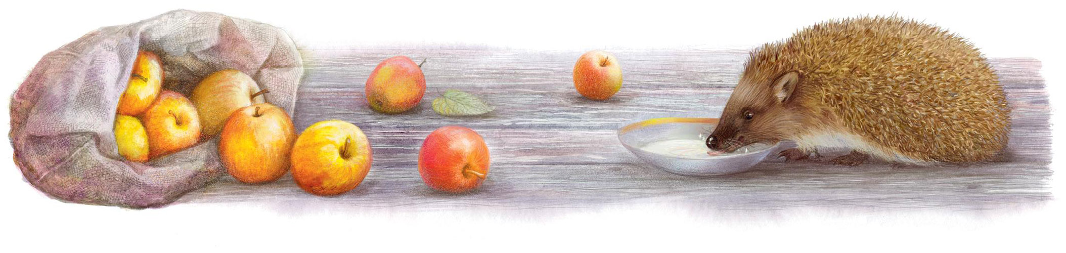 Вот ёж подбежал, свернулся около яблок, дёрнулся и опять бежит – на колючках другое яблоко тащит в гнездо.