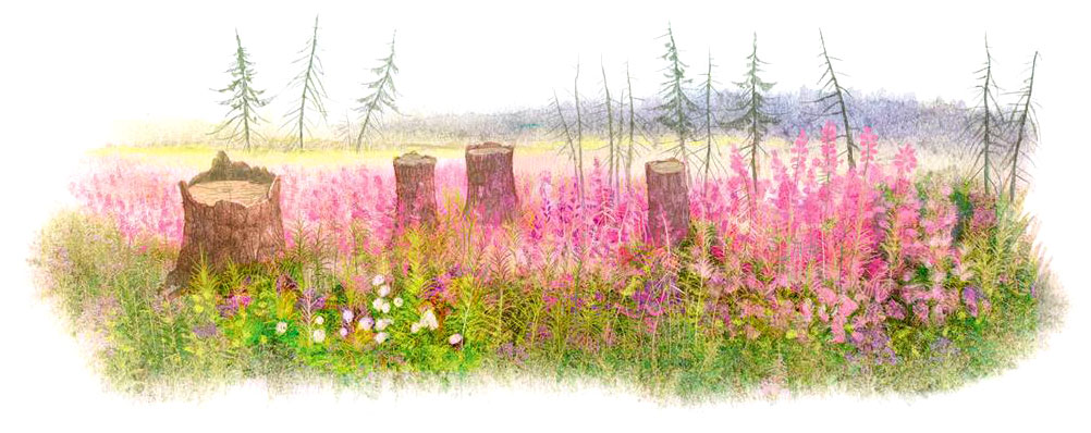На вырубке вокруг старых чёрных пней было множество высоких, ёлочкой, красных цветов, и от них вся вырубка казалась красной, хотя гораздо больше тут было иван-да-марьи – цветов наполовину синих, наполовину жёлтых. Во множестве тут были тоже и белые ромашки, звонцы[5], синие колокольчики, лиловое кукушкино платье – каких-каких цветов не было! Но от красных ёлочек, казалось, вся вырубка была красная. А возле чёрных пней можно было ещё найти переспелую и очень сладкую землянику. Летним временем дождик совсем не мешает, я пересидел его под ёлкой; сюда же, в сухое место, собрались от дождя комары, и как ни дымил я на них из своей трубки, собаку мою Ярика они очень мучили. Пришлось развести грудо́к, как у нас называют костёр. Дым от еловых шишек повалил очень густой, и скоро мы выжили комаров и выгнали их на дождик. Но не успели мы с комарами расправиться, дождик перестал. Летний дождик – одно только удовольствие.
