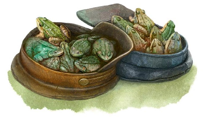 В этот год лягушек было множество, ребята скоро набрали два картуза[1]. Принесли ребята лягушек, стали давать и считать. Дали пять – проглотил, дали десять – проглотил, двадцать и тридцать, – да так вот и проглотил за один раз сорок три лягушки.