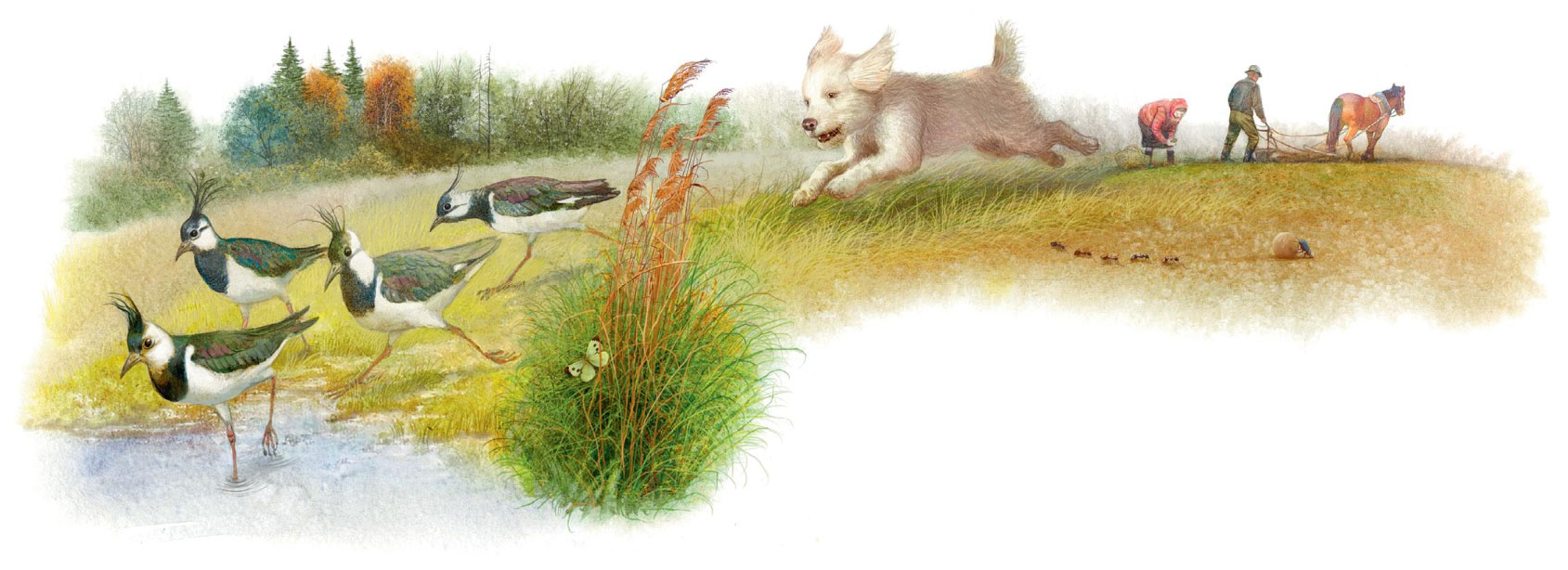 Наше поле лежит в виду озера. Видят меня белые чайки, слетаются. Грачи, галки – все собираются на мою борозду клевать червя. Спокойно так идут за мной во всю полосу белые и чёрные птицы, только чибис один, по-нашему, деревенскому, луговка, вот вьётся надо мной, вот кричит, беспокоится. Самки у луговок очень рано садятся на яйца. «Где-нибудь у них тут гнездо», – подумал я.