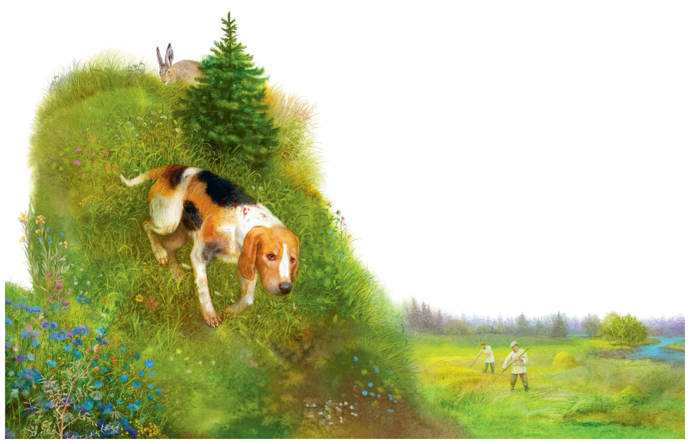 «Лучше умру!» – подумал мой заяц. И, завернув себе прямо в пяту, бросился на Трубача. И когда огромный пёс увидел, что заяц бежит на него, то в ужасе бросился назад и бежал не помня себя чащей и обдирал до крови спину. Так заяц и пригнал ко мне Трубача.