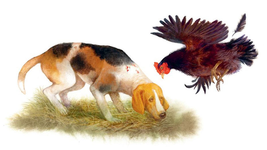Курица непобедима, когда она, пренебрегая опасностью, бросается защищать своего птенца. Моему Трубачу стоило только слегка нажать челюстями, чтобы уничтожить её, но громадный гонец, умеющий постоять за себя и в борьбе с волками, поджав хвост, бежит в свою конуру от обыкновенной курицы.