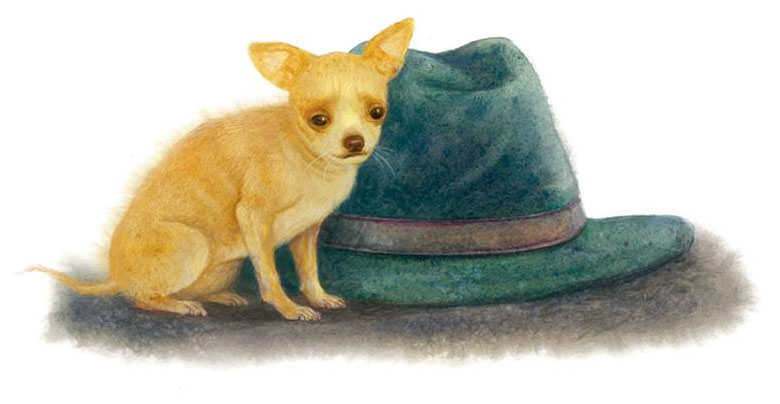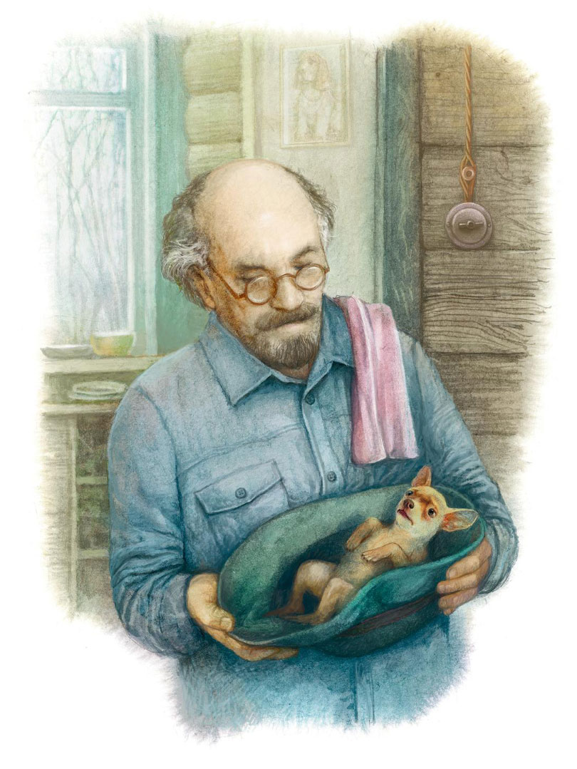 И вдруг с очень доброй улыбкой вынул из своей кофты притаённую за пазухой собачку, каких я в жизни своей никогда не видел и, наверное, у нас в Москве мало кто видел. Моей мягкой шляпой её можно было бы прикрыть, прихватить и так унести. Она была рыженькая, с очень короткой шерстью, почти голая и, как самая тоненькая пружинка, постоянно отчего-то дрожала. Такая маленькая, а глазищи большие, чёрные, блестящие и навыкате, как у муравья.