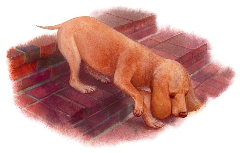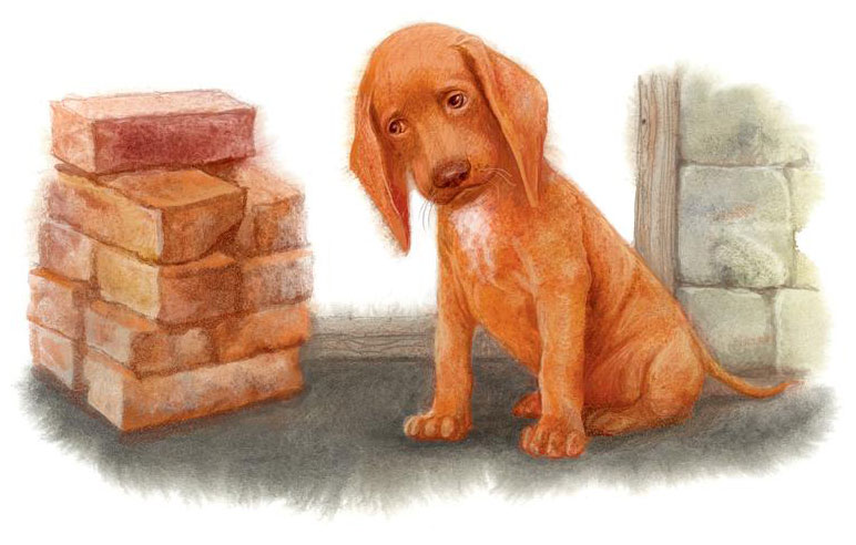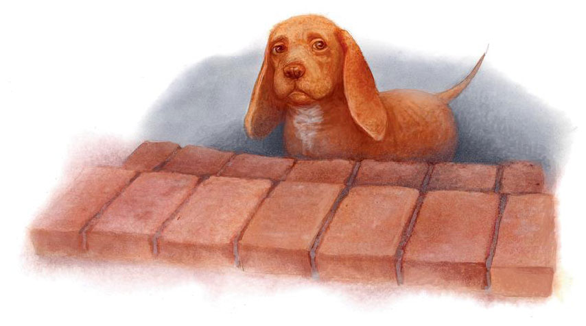 Но кирпичу можно хоть сто лет лежать, а живому пёсику трудно, устал и дрожит.
