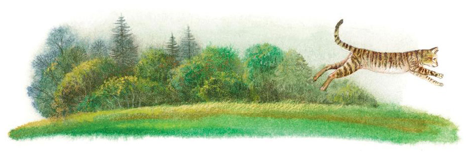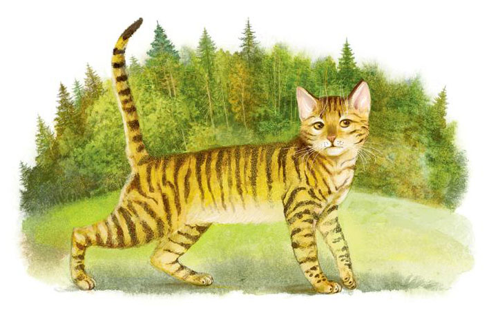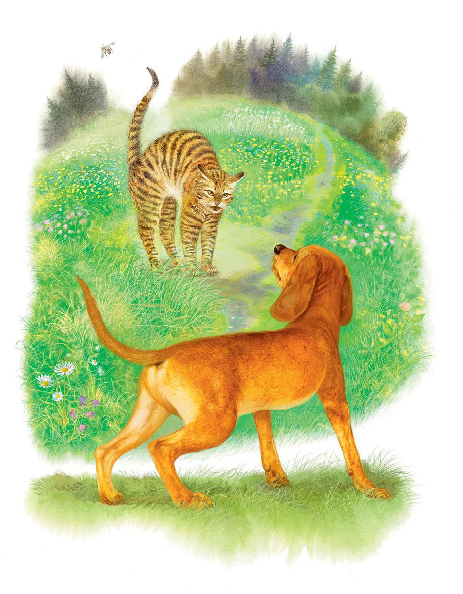 Вокруг на большом пространстве не было ни одного дерева, на которое кот мог бы взобраться и спастись от собаки, – кусты и полянки без конца. Я иду медленно, как черепаха, разбирая следы Ромкиных лап на влажной земле, на грязи, по краям луж и на песке ручьёв. Много перешёл я полянок, мокрых и сухих, перебрёл два ручейка, два болотца, и наконец вдруг всё открылось: Ромка стоит на поляне неподвижный, с налитыми кровью глазами; против него, очень близко, – тигровый кот; спина горбатым деревенским пирогом, хвост медленно поднимается и опускается. Нетрудно мне было догадаться, о чём они думали.