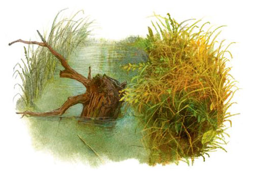 Он послушался, подкрался. Ручей струился по камушкам только посредине, а по сторонам застойная вода его была подёрнута слоем зеленоватой тины. Ветер подогнал края этой тины к берегу и развесил на прутиках, как большую зелёную тряпку.