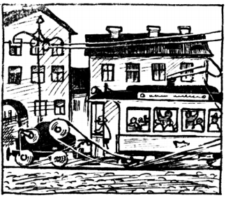 Впереди трамвая катится небольшая платформа с динамо-машиной, которая нагуливает ток при движении. Так что верхний трамвайный провод будет служить только для разгона, а потом трамвай будет катиться на своем хозрасчете.