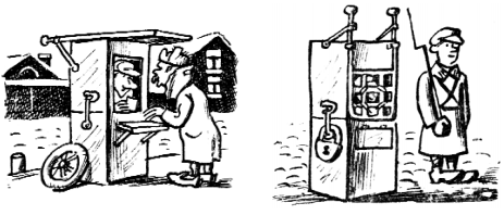 Однако, практика многих лет показала, что эти бездушные машины не отличаются четкостью работы, а также мало пригодны для нашего сурового климата и жуликоватой публики, пихающей в аппарат не те монеты и дешевенькие перламутровые пуговицы. Одним словом, эти автоматы зачастую для удобства публики находятся в простое и тем самым, может быть, делают щель в нашей тяжелой индустрии. Однако, можно избежать этого, стоит только использовать все средства для полнейшей механизации.