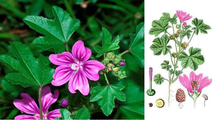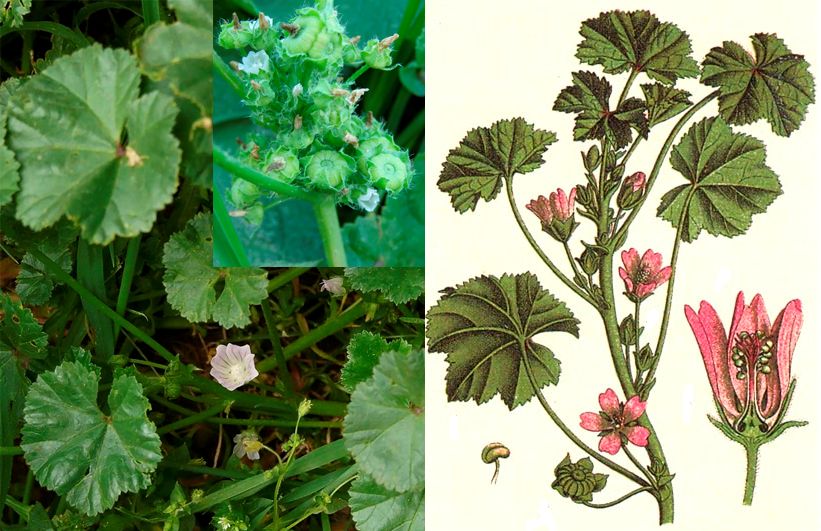Травянистое растение Стебель прямой, обычно покрыт рассеянными волосками, в основном ветвистый, высотой 30-120 см. Листья на длинных черешках, по краям зубчатые, с округлыми пластинками. Цветков обычно несколько и находятся в пазухах листьев, венчик розового цвета, в 3–4 раза больше чашечки, лепестки длиной до 2,5 см. Плоды составные, состоящие из голых, морщинистых плодиков.