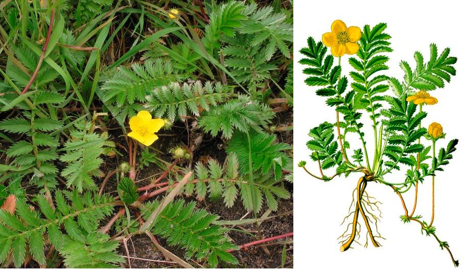 Низкорастущее травянистое растение со стелющимися красными столонами, достигающими 80 сантиметров в длину. Корневище толстое, цилиндрическое, с многочисленными мелкими корнями. Листья в длину 10–20 сантиметров, равномерно непарноперистые, сверху зелёные, гладкие, снизу беловатые, сильно опушённые, разделённые на листочки. Волоски покрывают также стебель и столоны, из-за этого растение выглядит серебристым. Цветки небольшие с 5–7 жёлтыми лепестками, растут на отдельных стеблях. Плод – многоорешек.
