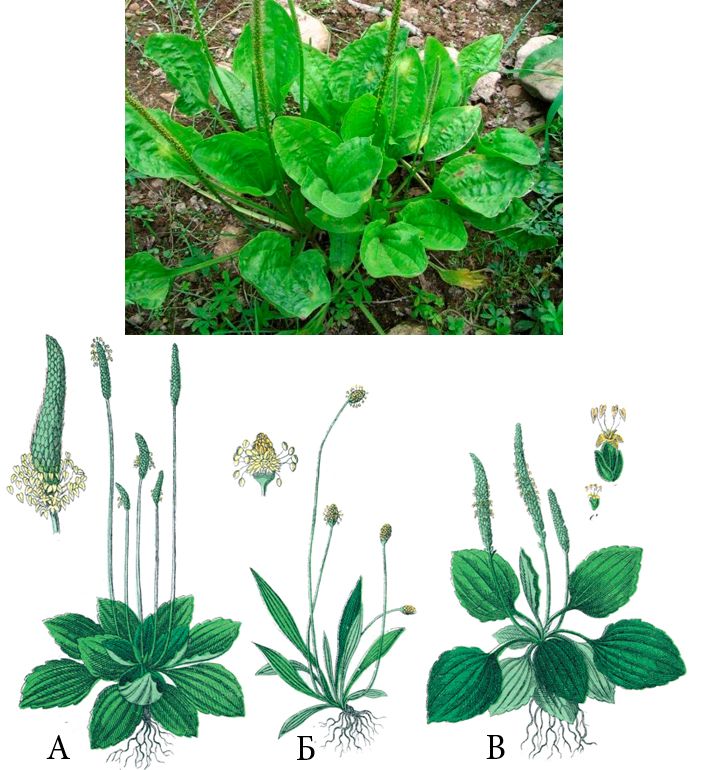 Травянистое растение. Корневище короткое, усаженное тонкими нитевидными корнями. Листья собраны в прикорневую розетку, черешковые, овальной формы, иногда вытянутые. Цветоносы прямостоячие, при основании восходящие, высотой 15–45 см, заканчивающиеся цилиндрическим соцветием – колосом. Цветки мелкие. Плод – многосемянная коробочка. Можно встретить несколько видов подорожника: А – Средний, Б – Ланцетовидный, В – Большой, по своим свойствами они примерно одинаковые.