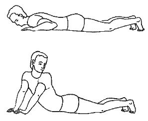 Исходное положение: лежа, ладони поставить на пол под плечами пальцами вперед, бедра приподнять над полом так, чтобы большие пальцы ног касались пола, ступни раздвинуты примерно на 30 см. На вдохе, распрямляя руки, поднимаем грудную клетку, выполняя прогиб в спине. Взгляд устремлен вверх. Когда вы примете такое положение, поворачивайте голову, плечи и туловище, пока не удастся увидеть противоположную пятку (если вы поворачиваетесь вправо, то надо смотреть на левую пятку). Не прекращая движения, вернуться в исходное положение и выполнить поворот в другую сторону. Повороты также осуществлять относительно талии, нижняя часть туловища должна оставаться параллельной полу. Возможны лишь прогибы вниз. Это двойное упражнение повторить 4 раза. Общая продолжительность 10–15 сек.