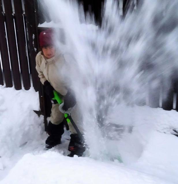 Шестидесятилетняя бабушка с маломощной электролопатой чистит двор в ожидании любимого внука