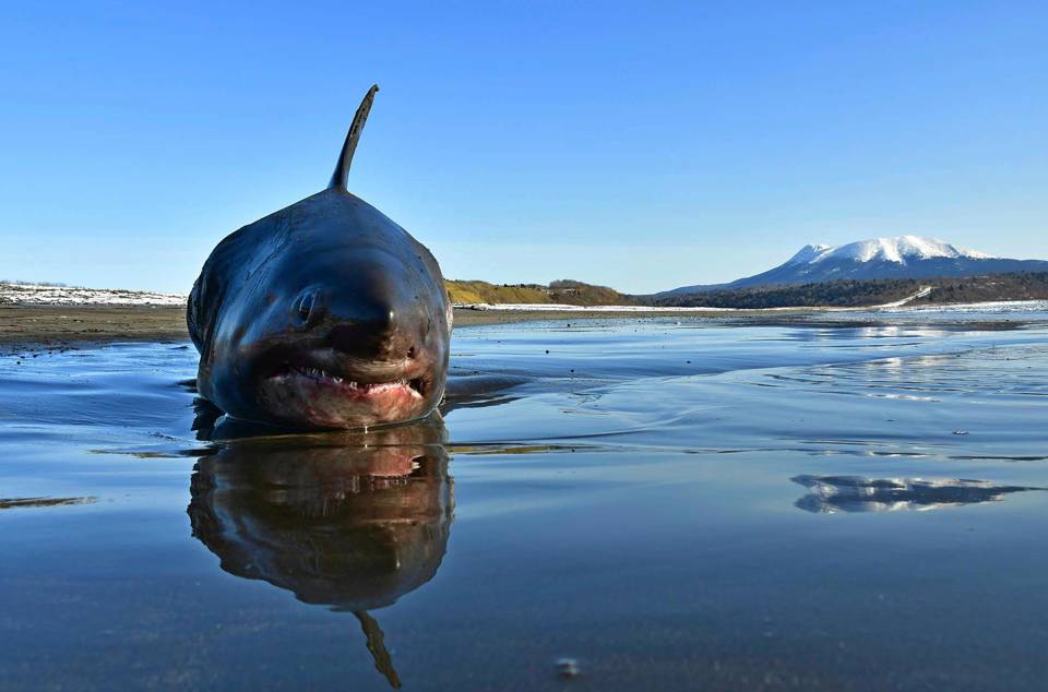 Тихоокеанская сельдевая акула на берегу Тихого океана. Кунашир