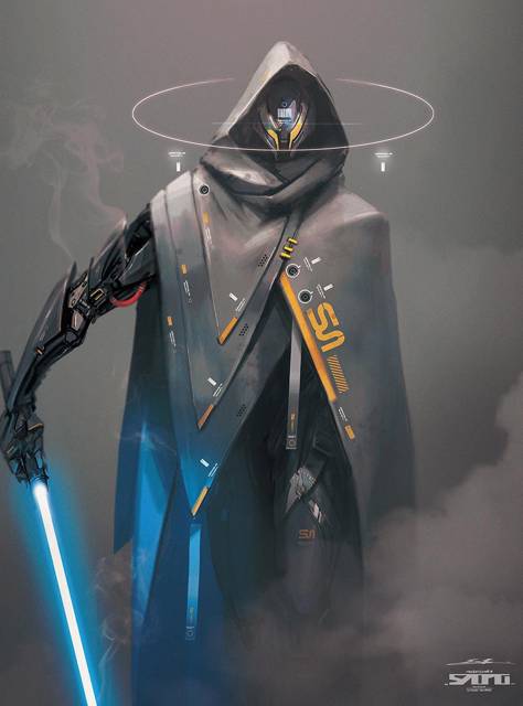 И рядом с ним закутанный с ног до головы в технологичный доспех, воин, укрытый капюшоном. В руках он держал плазменный меч.