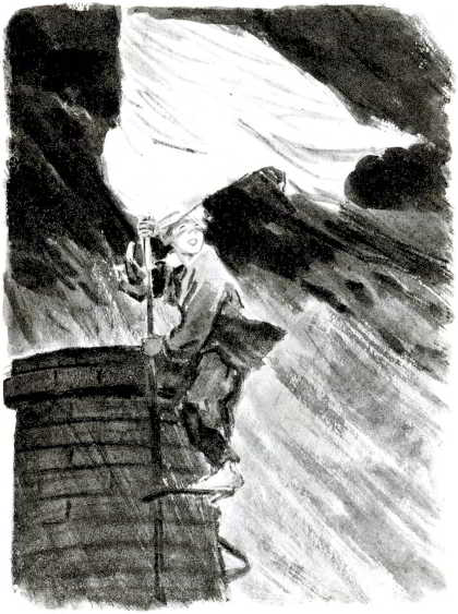 Лёнька снова карабкается по трубе. Скобки влажные, холодные, от них стынут пальцы. Дует мокрый ветер. Чем выше взбирается Лёнька, тем сильнее он дует. Лёнька прижимается к кирпичам, прячет от ветра лицо. У Лёньки намокла голова, струйки воды стекают за широкий ворот куртки.