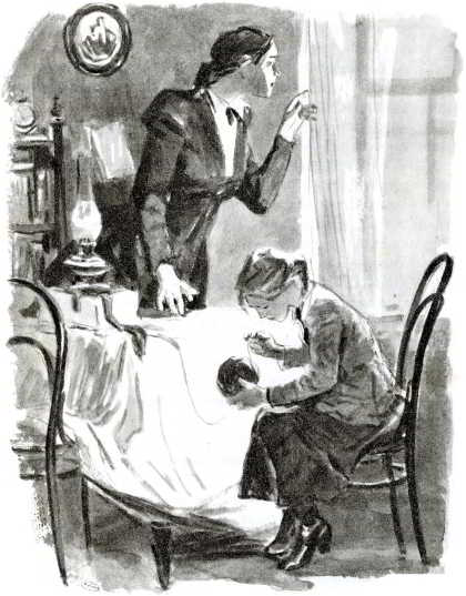 Нюта, испуганная, молча прижалась к столу, на котором стоял картонный коробок с вязальными спицами и клубками шерсти.