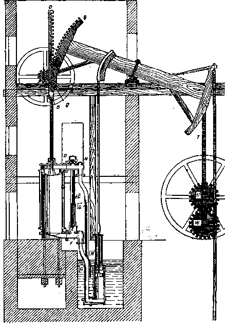 Главная трудность при применении этого изобретения возникла в устройстве передачи. Соединение штока поршня с коромыслом посредством цепи, очевидно, не годилось при рабочем движении в обоих направлениях. Первоначально Уатт применил сцепление зубчатого штока поршня с зубчатой дугой на конце коромысла. Приспособление это было не ново и нельзя было сказать, чтобы особенно удачно. Экспериментальная машина, «машина вверх и вниз», как называл ее Уатт, чуть ли не каждый день ломала зубцы на рейке или на коромысле, но Уатт был все же очень доволен.
