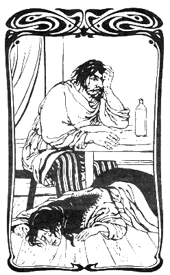 Матрена, худая и высокая баба, лет двадцати пяти, но казавшаяся старше от своей худобы, одетая по-городски, как одеваются мещанки и торговки нелепо и некрасиво, сидела у стола, положив одну руку на стол, другую на колени.