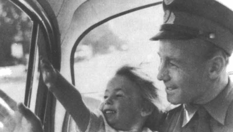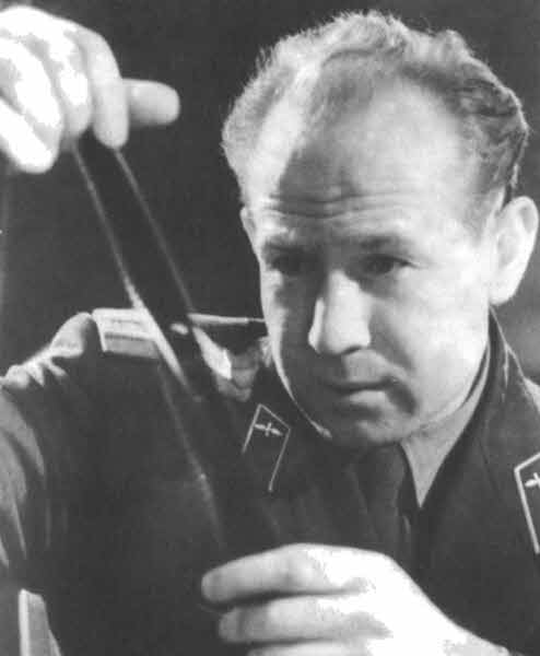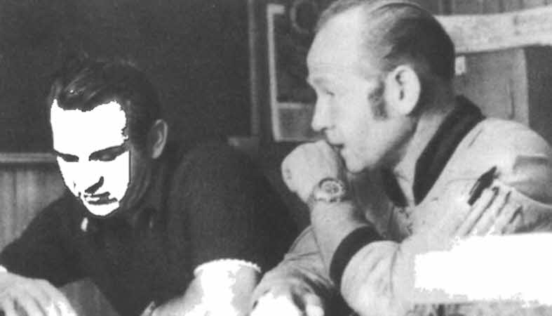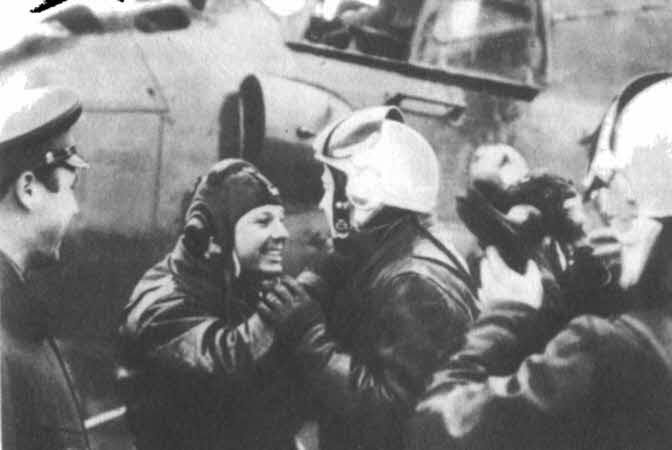 Юрий Гагарин поздравляет Алексея Леонова с завершением программы полетов на вертолетах