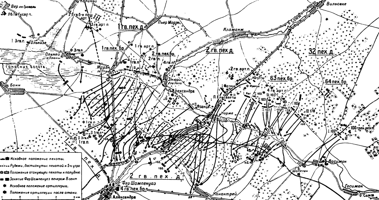 2–я гв. пех. дивизия, которая получила приказ в 11 ч. 45 м. вечера в Кламанже, должна была наступать, примыкая к 32–й пех. дивизии, левым флангом через Норме на середину Конантрай (Connantray).