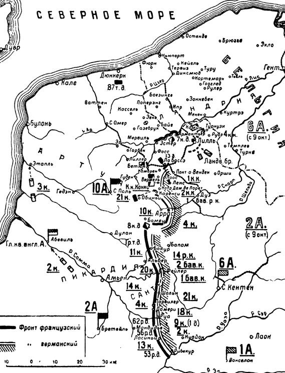 С германской стороны для этих же целей осуществлялась отмеченная выше переброска 6–й армии. На совещании 18 сентября в Люксембурге при участии Мольтке,полковника Таппенаи кронпринца баварского Фалькенхайн(командующий 6–й армией) так сформулировал цель этого маневра: «6–я армия имеет задачей при помощи первых частей, прибывающих на место (21–й корпус), отбросить отряды противника, недавно появившиеся на правом фланге армий, и взять на себя обеспечение этого фланга. Однако, главная и постоянная цель 6–й армии – одержать решительную победу на правом крыле нашего расположения как можно быстрее 1 и с теми силами, которые будет возможно ввести в бой, если нужно, даже введя их последовательно» [361]361