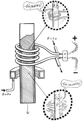 С помощью токов высокой частоты. Тех же самых токов высокой частоты, которые работают в радиоприемниках и радиопередатчиках. Их излучателем, антенной, является как раз та медная спираль, внутри которой оказалась наша деталь. В ее теле возникли паразитические замкнутые токи, которые и вызвали этот быстрый нагрев.