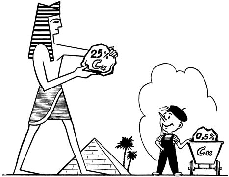 Конечно же, в первую очередь во все времена металлурги разрабатывали наиболее богатые руды этого металла. По всей вероятности, не менее 25 процентов меди содержалось в руде острова Кипра, по имени которого и названа по-латински медь – «купрум». Не худшими были, вероятно, и древние месторождения Испании, разрабатывавшиеся еще за 100 лет до нашей эры. Постепенно истощались богатые залежи медной руды, но еще сто лет назад рентабельными считались лишь те руды, что содержали не менее 10–15 процентов меди. Сегодня такие руды встречаются еще только в некоторых месторождениях Конго, на Черном материке, к богатствам которого несколько позже прорвались европейские капиталисты. А обычное содержание меди в большинстве разрабатываемых сегодня месторождений не превышает 2–3 процентов.