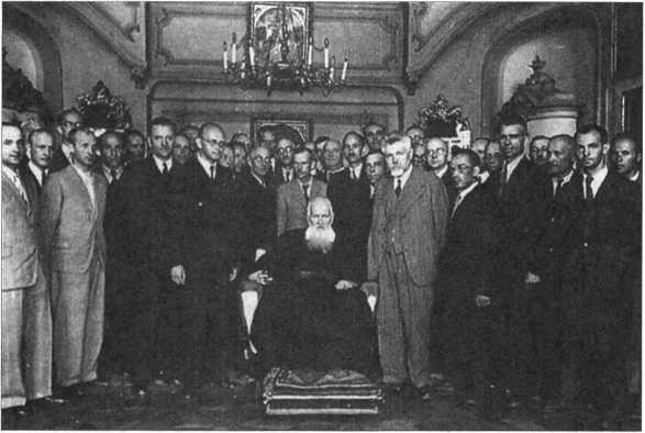 Митрополит Андрей (Шептицкий) с членами Украинского центрального комитета. Слева от него – Владимир Кубийович (глава УЦК), справа – Василий Симович. 1943 г.
