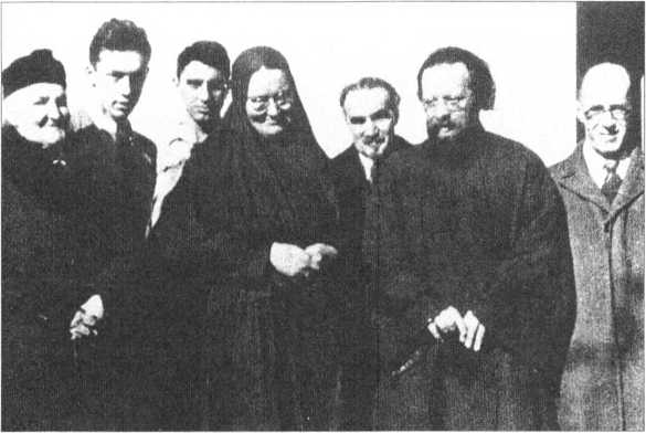 Слева направо: С.Б. Пиленко, Юрий Скобцов, Алексей Бабаджан, мать Мария, профессор Г.П. Федотов, о. Димитрий (Клепинин), К.В. Мочульский