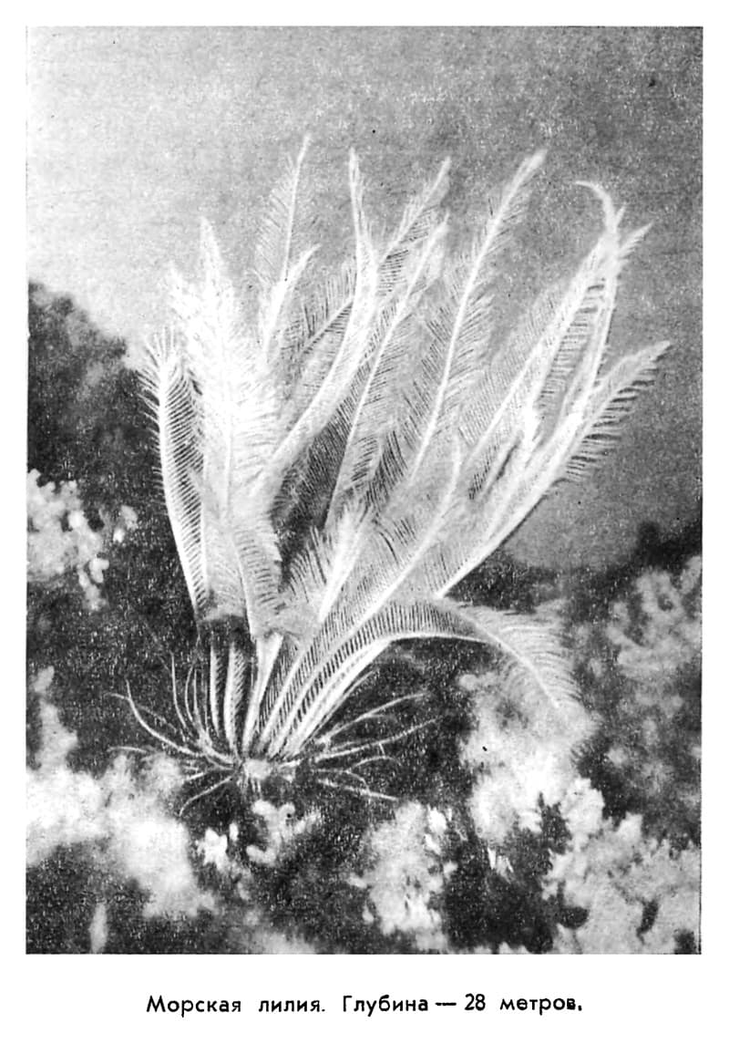 Наконец коснулся дна. В двух метрах от меня лежала вертушка – я и не думал, что она так велика. Белый обтекаемый поплавок с одной стороны оканчивался двумя стабилизаторами, с другой торчало прозрачное колесо счетчика течений. Однако не прибор прежде всего привлек мое внимание: рядом со мной колыхались в воде необыкновенные щупальца какого-то животного исключительной красоты. Чрезвычайно нежные, ажурные, длиной почти в полметра, они совершенно симметрично поднимались со дна, образуя изящный колокол. Мне никогда не приходилось видеть ничего подобного, но я сразу понял, что это морская лилия. Морские лилии не растения, как можно подумать, а животные, родственные морским ежам и морским звездам. В далеком прошлом они были широко распространены в морях, а сейчас представители этой, когда-то многочисленной группы встречаются довольно редко, в основном в тропиках или на больших глубинах, и мало кому доводилось видеть их под водой. Рядом с морской лилией росли тоже странные невиданные животные – со дна поднимался целый лес гидроидов, необычайные асцидии с короткой сморщенной шейкой и округлым, блестящим, розовым телом. Глубина была 42 метра, значительно больше, чем при всех наших предыдущих спусках в Антарктике.