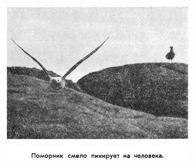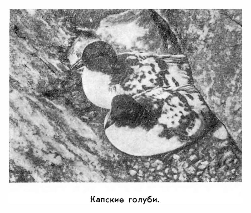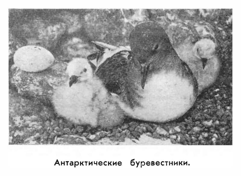 Немного отдохнув, снова пошли вперед – внизу под островом по-прежнему были видны трещины и большие разводья, на пути то и дело встречались пингвиньи колонии. Мы старались их обходить, но это не всегда удавалось. В ушах стоял назойливый крик, солнце пекло, поморники не давали покоя. Постепенно берег стал повышаться, затем мы перешли небольшой ручеек, стекавший в море. Ручей вытекал из озера, которое серебрилось в центре острова. Зеркало озера, блестевшее в лучах солнца, силуэты пингвинов вокруг него – все это дышало покоем, но нужно было двигаться дальше и мы опять полезли вверх по скалам. Пингвины больше не встречались, не могли сюда добраться, но зато всюду – под камнями, в щелях и трещинах – виднелись гнезда серебристо-серых буревестников. Это были довольно крупные, очень похожие на чаек птицы, яиц у них еще не было, но они уже сидели на своих гнездах, которые представляли собой просто ямку в песке и щебне, только кое-где лежало еще немного пуха. Буревестники подпускали нас вплотную, не сходили с гнезд и только пытались клюнуть подходящего. Отдельные птицы пробовали улететь, но не могли подняться прямо с земли и бежали по скалам, размахивая крыльями, к обрывам – только бросившись оттуда вниз, они могли начать полет. Кроме этих наиболее обычных буревестников, тут же располагались гнездовья капских голубей и антарктических буревестников, в гнездах которых уже кое-где лежали яйца. Над нами пролетали удивительно красивые, чисто белые снежные буревестники, морские птицы того же отряда, но гнезд их нам тогда не пришлось увидеть. В воздухе, точно ласточки, стремительно проносились крошечные качурки Вильсона, самые мелкие из всех морских птиц, гнездящихся на этих островах. Их гнезда помещались в таких узких расселинах в скалах, что добраться до них мы не могли. Беспрерывный птичий крик, запах помета постепенно стали очень неприятны, и вид множества птиц уже не доставлял нам никакого удовольствия.