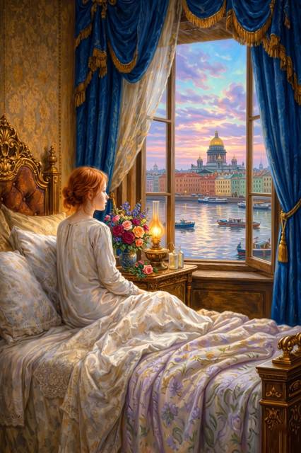 Комната, в которую я вошёл, была светлой – единственной по-настоящему светлой комнатой из всех, что я видел в этой квартире. Два больших окна выходили на Неву. Обои здесь были голубые, с серебристым узором, мебель – белая, лёгкая. На подоконнике стояли горшки с геранью, у стены – этажерка с книгами и фарфоровыми безделушками.