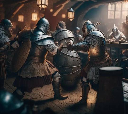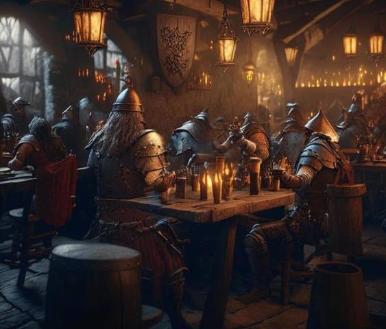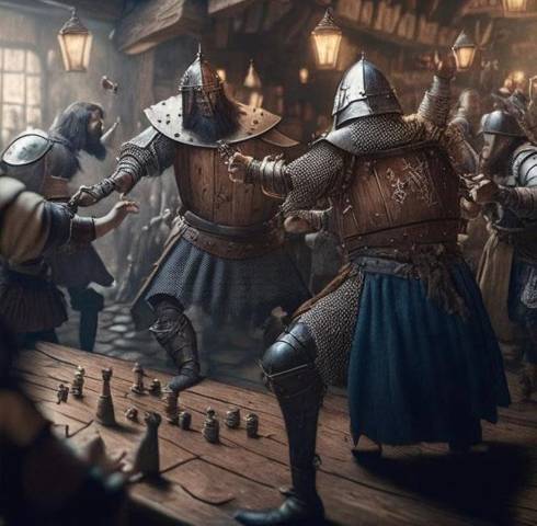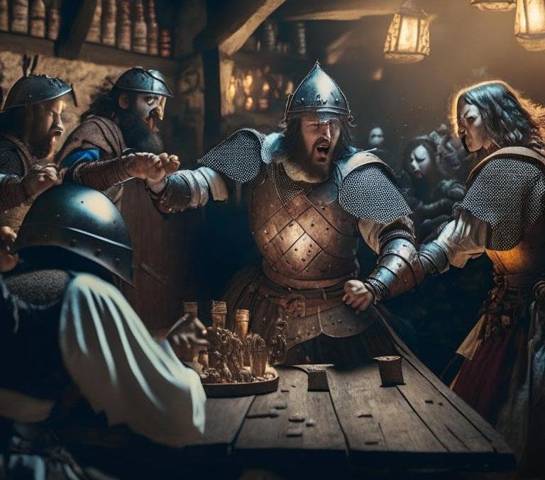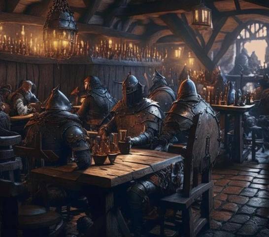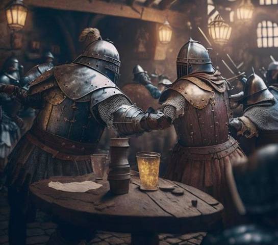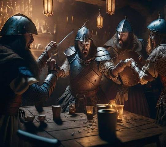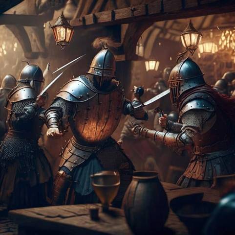 Патрульные, обнажив мечи врываются в проклятый кабак и видят такую картину… Все столы и лавки уже давно перевёрнуты. Металлические крепления выдраны с мясом. Разбитая люстра на полу, а сам пол густо залит человеческой кровью и засыпан как осколками посуды, так и обломками оружия. На полу, в различных позах лежат убиенные и стонут раненые свитские. Убитых, в разы больше. А с десяток пьяных мордоворотов ещё продолжают свой яростный и бессмысленный бой на кинжалах. Но количество бойцов тает на глазах, кинжалы остры и убивать ими свитские умеют.