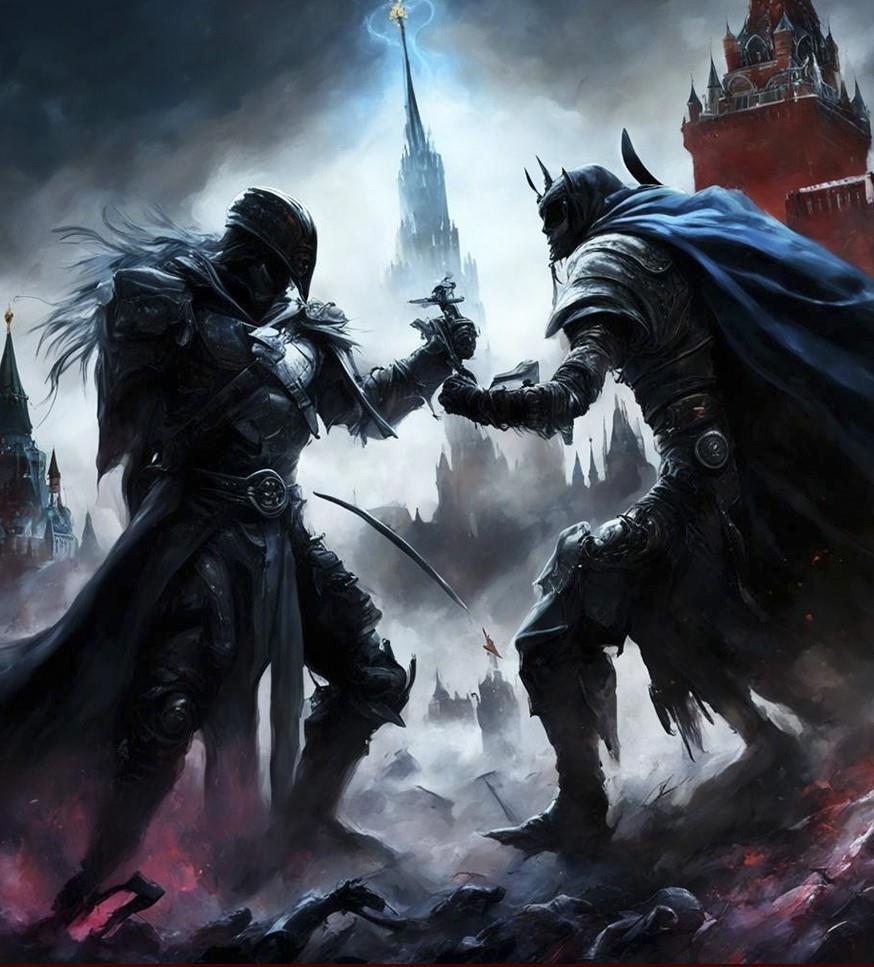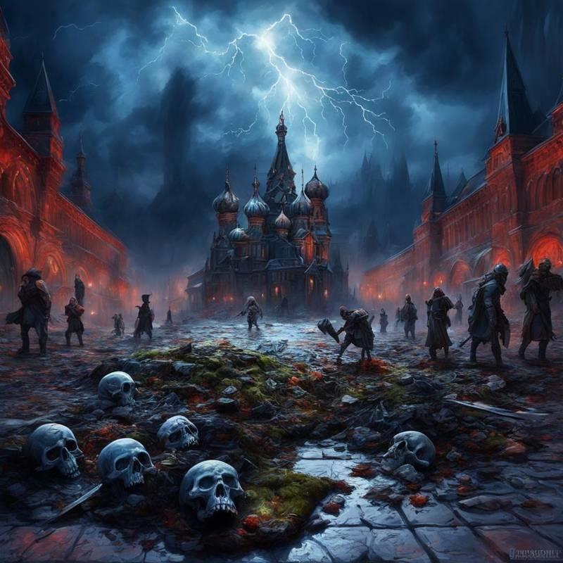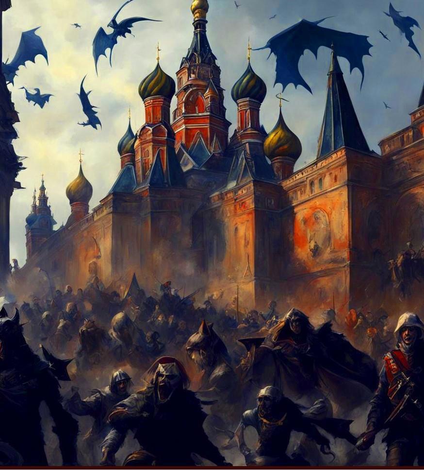 По всему московскому горизонту над Кремлём сверкали магические молнии и были видны сполохи взрывов дымных файерболов. Могучие «воздушные кулаки» и «тараны», каждый из которых был способен разом снести пол-Москвы, безжалостно крушили готические рыцарские замки и башни древних крепостей. Свирепые удары тяжёлыми боевыми мечами, разрубающими тела в железных латах и вдоль, и поперёк, и наискосок. Острые копья рвали человеческую плоть! Звенящие смертью спущенные тетивы боевых луков. Стрелы без счёта летали тучами и торчали, уже казалось, отовсюду. Отрубленные пальцы, головы, руки и ноги ковром буквально устилали брусчатку Красной Площади. Беззвучно ржали и вставали на дыбы красавцы боевые кони! Кровь текла рекой!