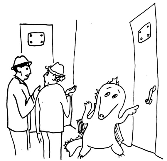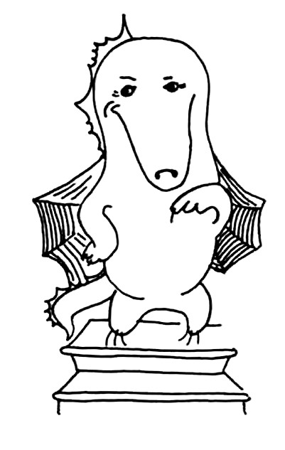 Покончив с надоедливой мебелью, Торп и Турп вышли на улицу и уселись на крылечке в ожидании непоседы-кастелянши. Но вместо нее они увидели кое-кого другого. А именно – некое крылатое существо, внешне напоминающее небольшого дракончика зелено-бурого цвета. Тот как раз пролетал над их головами по направлению к окну мансарды, но, засмотревшись на наших героев, промахнулся, стукнулся о козырек крыши и свалился прямо перед ними, не сводя с Торпа и Турпа изумленных глаз.