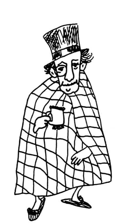 Дверь медленно, величественно распахнулась. На пороге стоял литератор, закутанный в клетчатый плед. Голову его украшал безукоризненный цилиндр черного шелка, а в глазу поблескивал монокль.