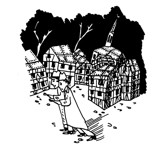 Они надели черные плащи и черные шляпы, и вышли из дома. Ночь была темная-претемная. Пока друзья спускались по лестнице вниз с холма, Турп два раза споткнулся и чуть не упал – ведь ступенек совсем не было видно. Наконец, они спустились и быстро пошли по улице к центральной площади. Дул сильный ветер, едва не срывая с них шляпы, и брусчатка мостовой таинственно поблескивала при свете фонарей.