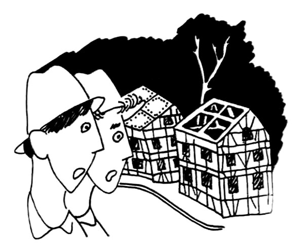 И снова пустынные улицы. Тихо. Тихо… Разве что тявкнет где-нибудь за забором щенок (видимо, приснилось что-то страшное: может быть, исчезновение его любимого ошейника с алюминиевыми звездочками?) да рыба плеснет в реке. Покой. Все крыши на месте, и на этот раз нигде не видно людей с клещами для выдергивания гвоздей, с пилами и топорами.