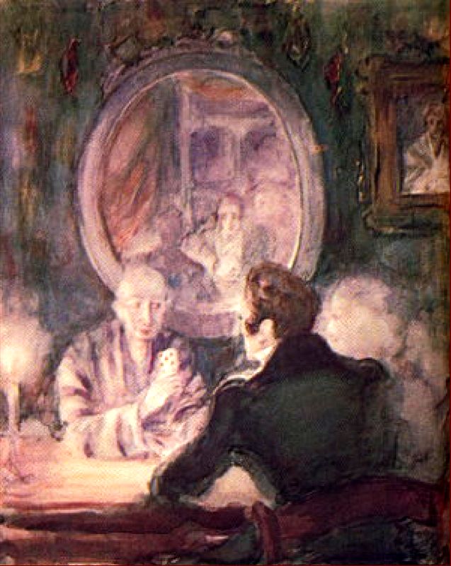 Старичок сел, как накануне, положил на стол две колоды карт, срезал одну и приготовился метать, по-видимому не ожидая от Лугина никакого сопротивления; в его глазах блистала необыкновенная уверенность, как будто они читали в будущем. Лугин, остолбеневший совершенно под магнетическим влиянием его серых глаз, уже бросил было на стол два полуимпериала, как вдруг он опомнился.