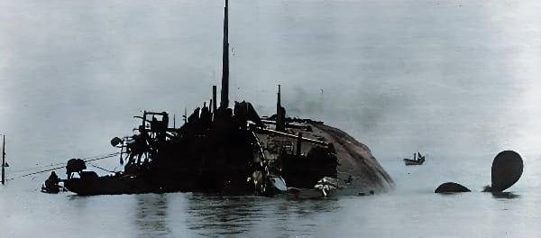 Как оказалось позднее, ещё 3! Дня болтался на воде и только 31 января 1904 года штормом был сорван с мели и, собрав ещё 2 мины, затонул в бухте Талиенван (недалеко от порта Дальний).