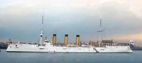 Крейсер на фоне этой полосочки. Ходит, дымит. В порт не лезет.