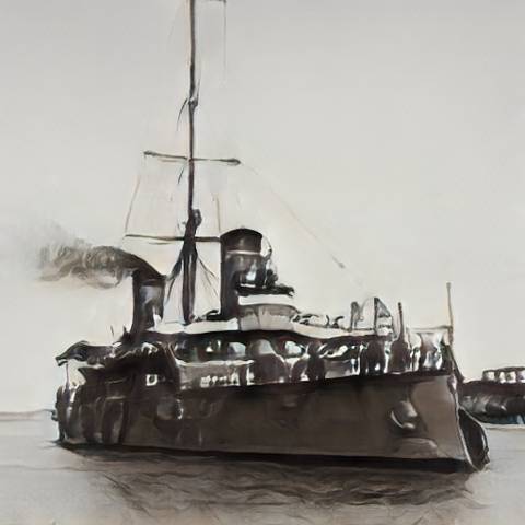 Часов за пять с хвостиком обернулся, немного прояснилось. В заливе точит транспорт и то ли катер, то ли миноноска. Короче мелочь у борта транспорта трётся. Оба под простыней первой разгульной ночи девственницы. Ну транспорт по крайней мере. У мелочи не видать…