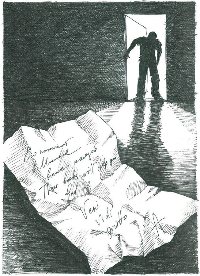 «Его почитают в Милане выше князей. Three books will help you find me. Veni, vidi, scritto». «Его почитают в Милане выше князей. Три книги помогут найти меня. Пришел, увидел, написал».
