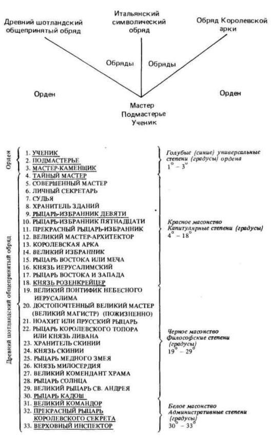 В данной главе мы постараемся проследить, насколько программа шотландского обряда соответствует действительности. Для наглядности ниже мы воспроизводим организационную структуру шотландского обряда и список степеней шотландской иерархии.