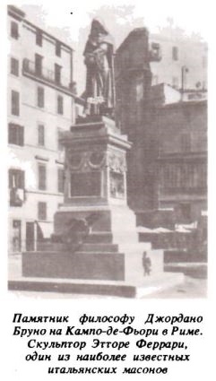 В последние двадцать лет на исходе столетия столкновение между католической церковью и масонством в Италии приобрело драматический накал. Это было время, когда масоны организовали подписку по сбору средств на сооружение памятника Джордано Бруно в Риме. Памятник, созданный скульптором Этторе Феррари, который некоторое время спустя станет Великим Мастером Великого Востока Италии, был открыт 9 июня 1889 г. в присутствии более трех тысяч братьев-масонов, собравшихся под своими знаменами, обычно хранящимися в ложах.