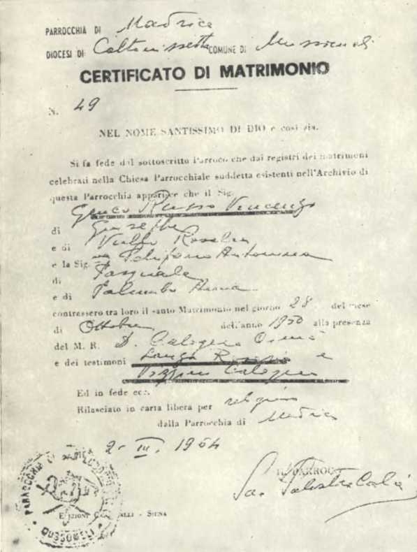 Фотокопия брачного свидетельства сына Джузеппе Дженко Руссо. В качестве свидетелей под ним подписались главарь мафии Кало Виццини и депутат Розарио Ланца, председатель сицилийского областного собрания.