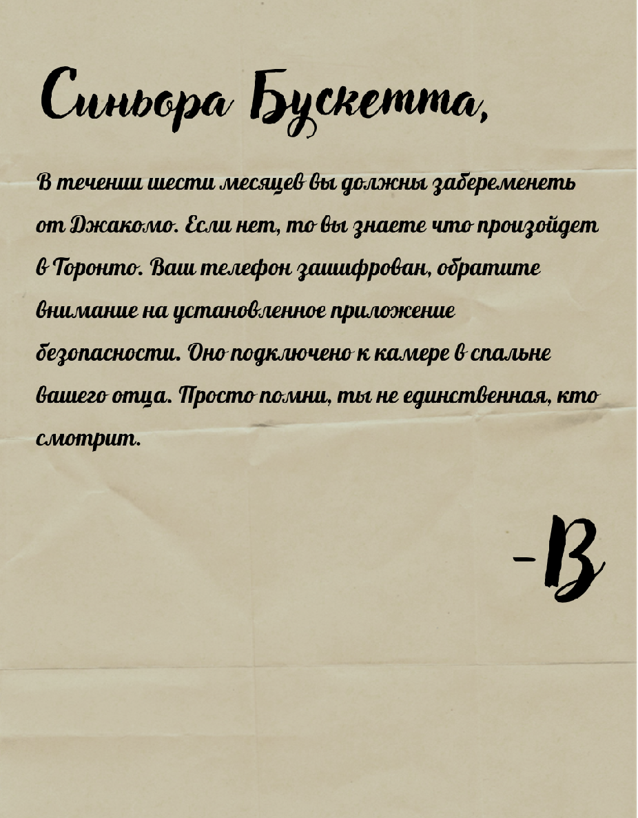 Мой желудок сжался, паста с баклажанами грозила выйти наружу. Это прислал мне Вирга. Почему это происходит? Я никому не причинила вреда. Всю свою жизнь я следовала правилам и никогда не переступала черту. Мои две старшие сестры были достаточно дикими для всех нас, всегда создавали проблемы и раздражали нашего бедного отца.