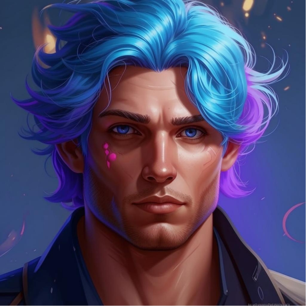 В его голубых с фиолетовыми прядями волосах сверкали серебряные нити, а яркие выразительные голубые глаза сияли, точно драгоценные камни.